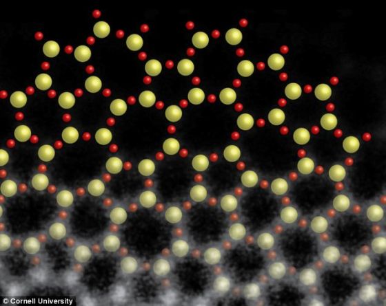 最薄玻璃的顯微圖像與根據德國學者威廉-扎哈里阿森1932年提出的假設描繪的圖像重疊在一起。圖像中的紅點是氧原子,黃點是硅原子